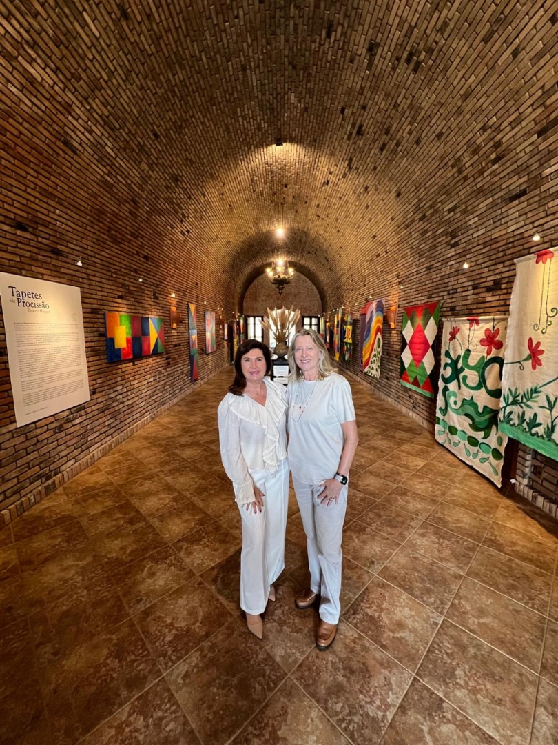 A exposição Tapetes de Procissão, da artista visual Beatriz Harger, ficará aberta para visitação até 14 de julho na Galeria de Arte da Villa Francioni, em São Joaquim. A abertura, realizada no último sábado (14), reuniu o público para conhecer as 24 obras que revisitam a tradição dos tapetes confeccionados para a Procissão de Corpus Christi, manifestação religiosa de origem medieval ainda presente em diversas cidades brasileiras. Entre as autoridades que prestigiaram o evento estava o prefeito de Florianópolis, Topázio Neto, e as conselheiras da Villa Francioni Daniela Borges de Freitas (presidente) e Adriana Borges de Freitas.